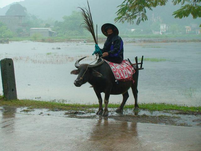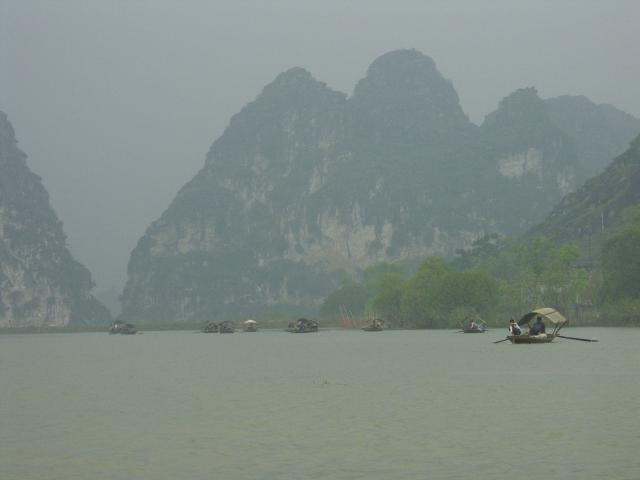 Heute machen wir einen Tagesausflug in die Karstlandschaft der Trockenen Halonbucht. Sie macht ihrem Namen aber keine Ehre. Es war nass und regnerisch, schlimmer noch - ein vorangegangener tropischer Wirbelsturm hat die ganze Landschaft, einschließlich der Wohnhütten, unter Wasser gesetzt. Solche Tragödien ertragen die Vietnamesen augenscheinlich mit stoischer Gelassenheit. Die Trockene Halonbucht ist übrigens nicht zu verwechseln mit der bekannteren Inselwelt der normalen Halonbucht. Zu dieser kommen wir in ein paar Tagen. In früherer Zeit war die Trockene Halonbucht eine vom Meer bedeckte Bucht, in der noch heute große Berge und Felskegel in einer atemberaubenden Szenerie aus den sich weithin ausdehnenden Reisfeldern ragen. Wir machen im strömenden Regen eine Bootstour durch die Bucht. Die Boote dort sind sehr klapprig, aber sie haben wenigstens ein Dach.