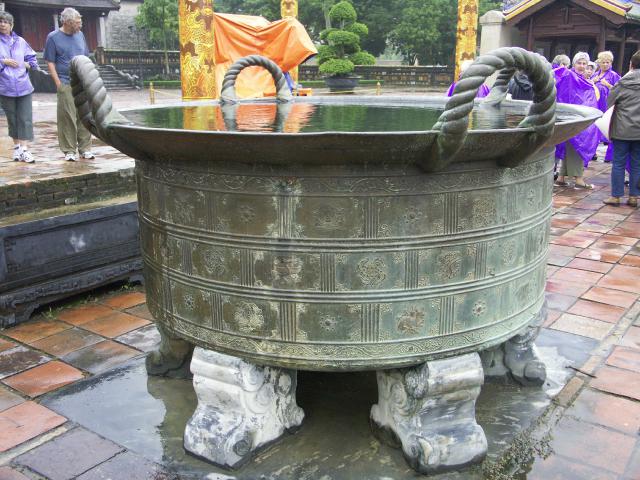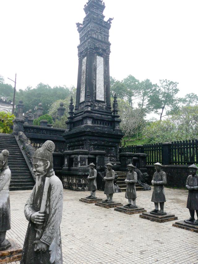 Am frühen Morgen, ja teilweise mussten wir schon um 5.30 Uhr aufstehen, fliegen wir in die Stadt Hué. Auch sie gehört zum UNESCO-Kulturerbe. In Hué besichtigen wir die verbotene Stadt, die alte Kaiserstadt. Sie wurde am Anfang des 19. Jahrhunderts nach dem Vorbild der verbotenen Stadt in Peking gebaut. Anschließend geht es weiter zum Kaisergrab von Khai Dinh, welches zu den letzten der Nguyen-Dynastie zählt. An dem Grab haben etwa 3000 Arbeiter mehrere Jahre gebaut. Es ist sehr aufwändig verziert. Das Kaisergrab liegt an den Hängen des Chau-E-Berges im Dorf Chau Chau. Es besitzt eine lange von Drachen gesäumte Treppe, die zum Grabmal führt. Auf einem Plateau, auf halbem Weg zum Grab, stehen steinerne Krieger und bewachen offensichtlich ihren Kaiser.