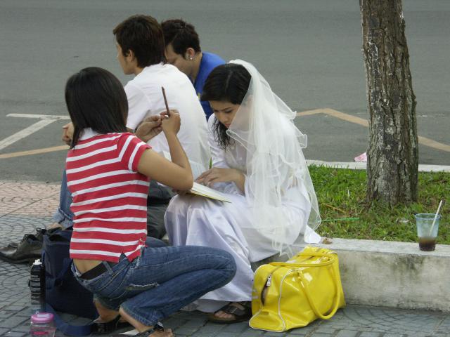 Wir sehen wie mitten in Saigon auf dem Fußweg eine Braut in ihrem Brautkleid frisiert und geschmickt wird. In Vietnam ist das völlig normal und niemand ist irritiert, denn in dem Land findet alles, was möglich ist, auch auf der Straße statt. Traditionell wird in den Wohnungen so wenig wie möglich gemacht, manchmal dienen die guten Stuben sogar als Mopedgarage.